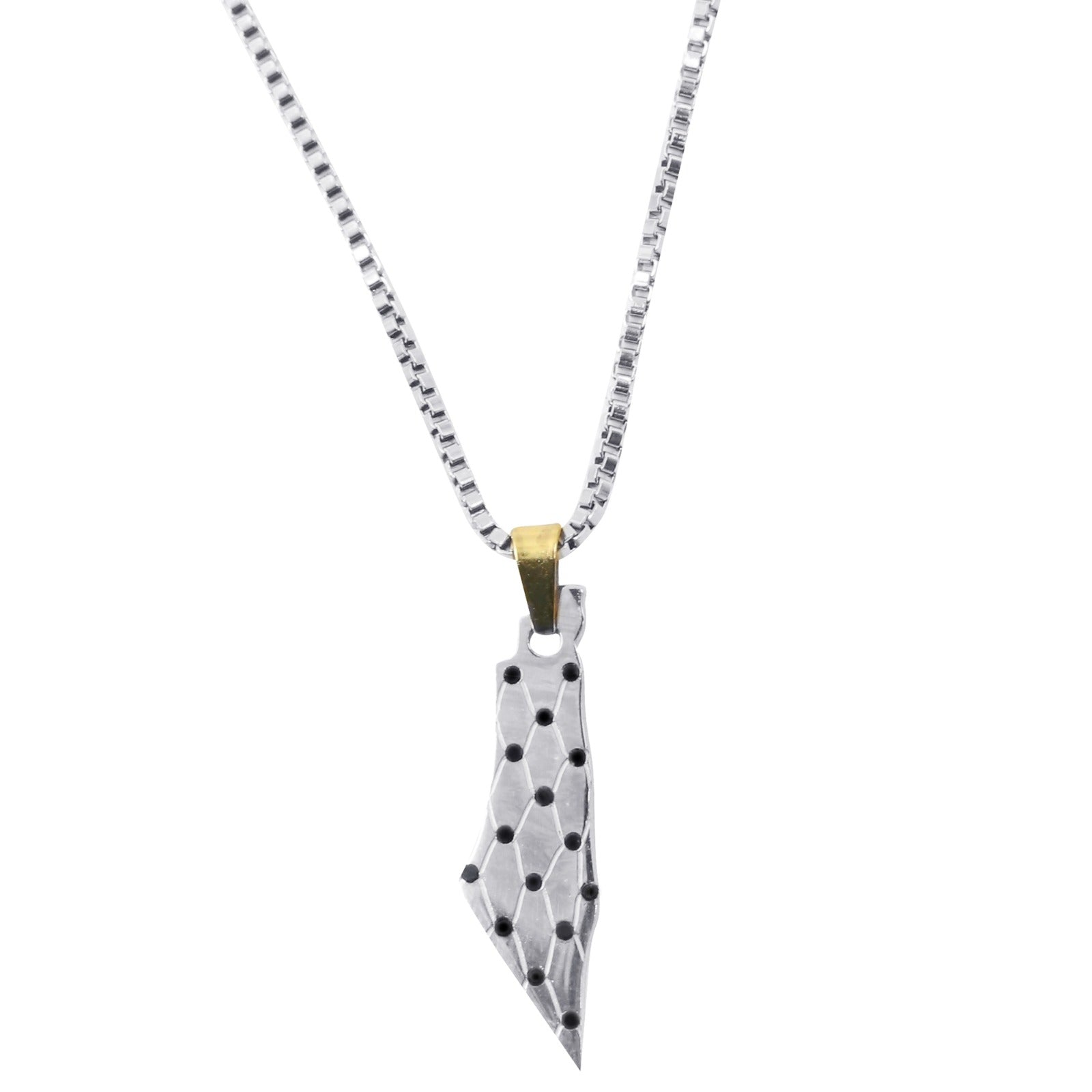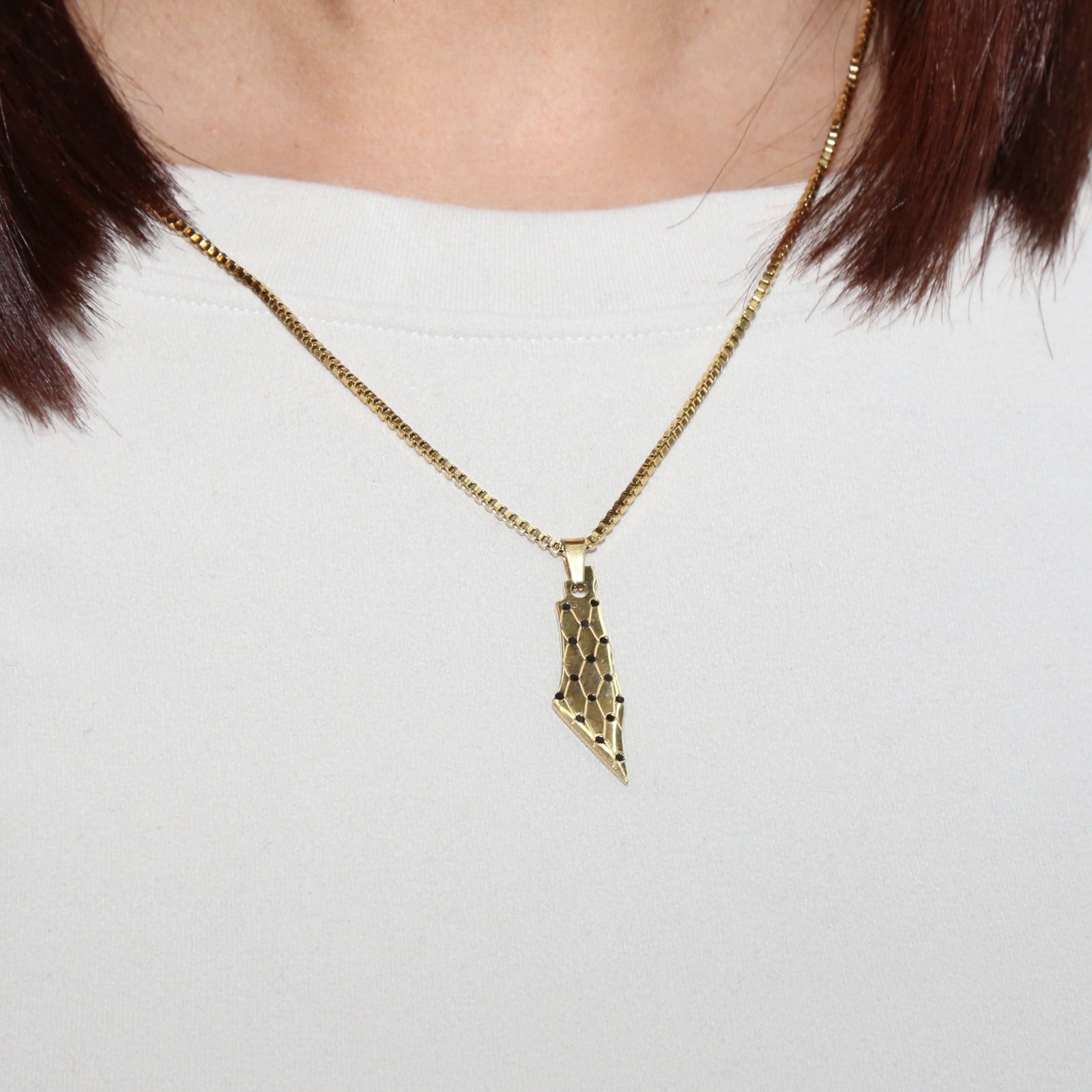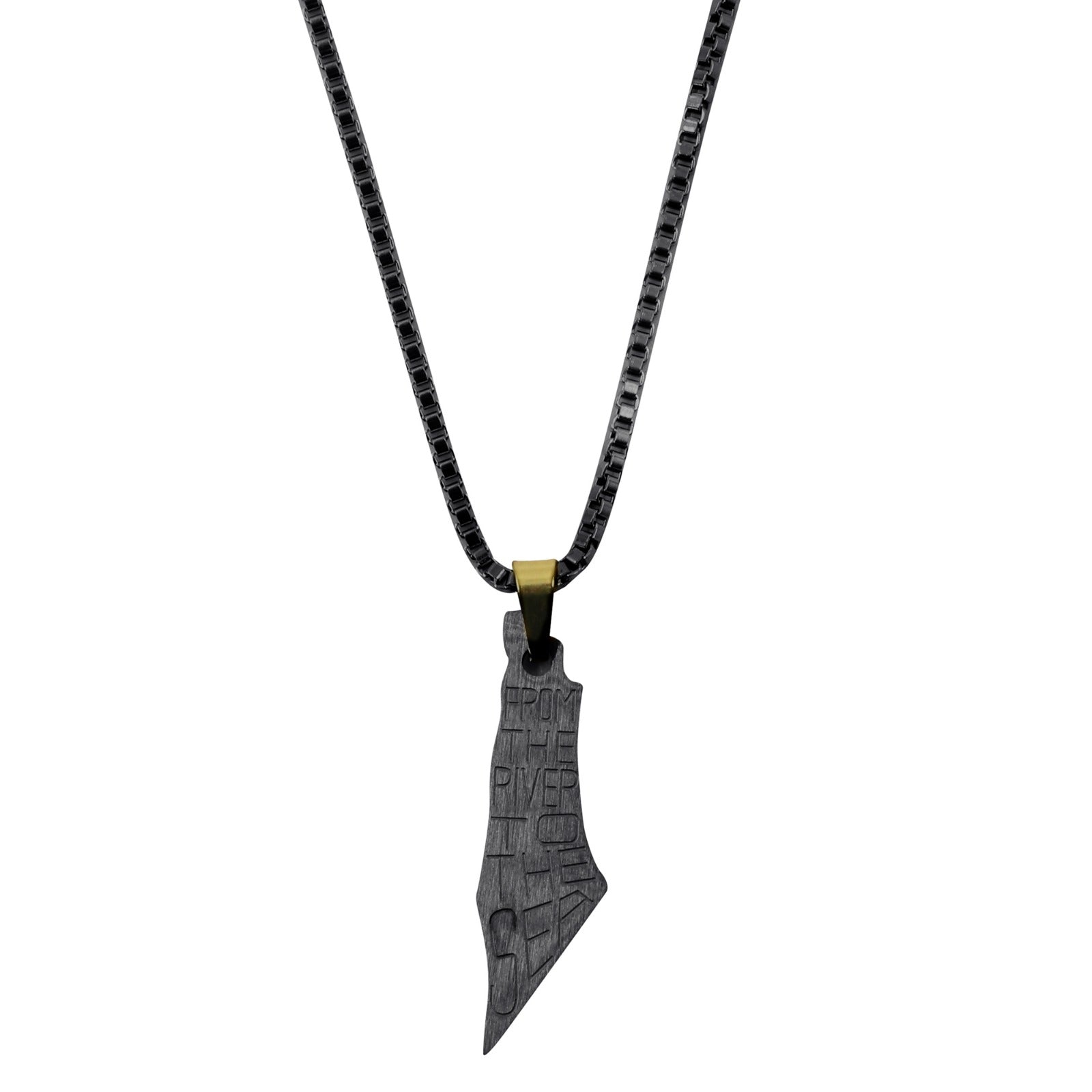 A Reversible Necklace With Black Cubic Keffiyeh on one side of the Map & the inscription of “From The River To The Sea”