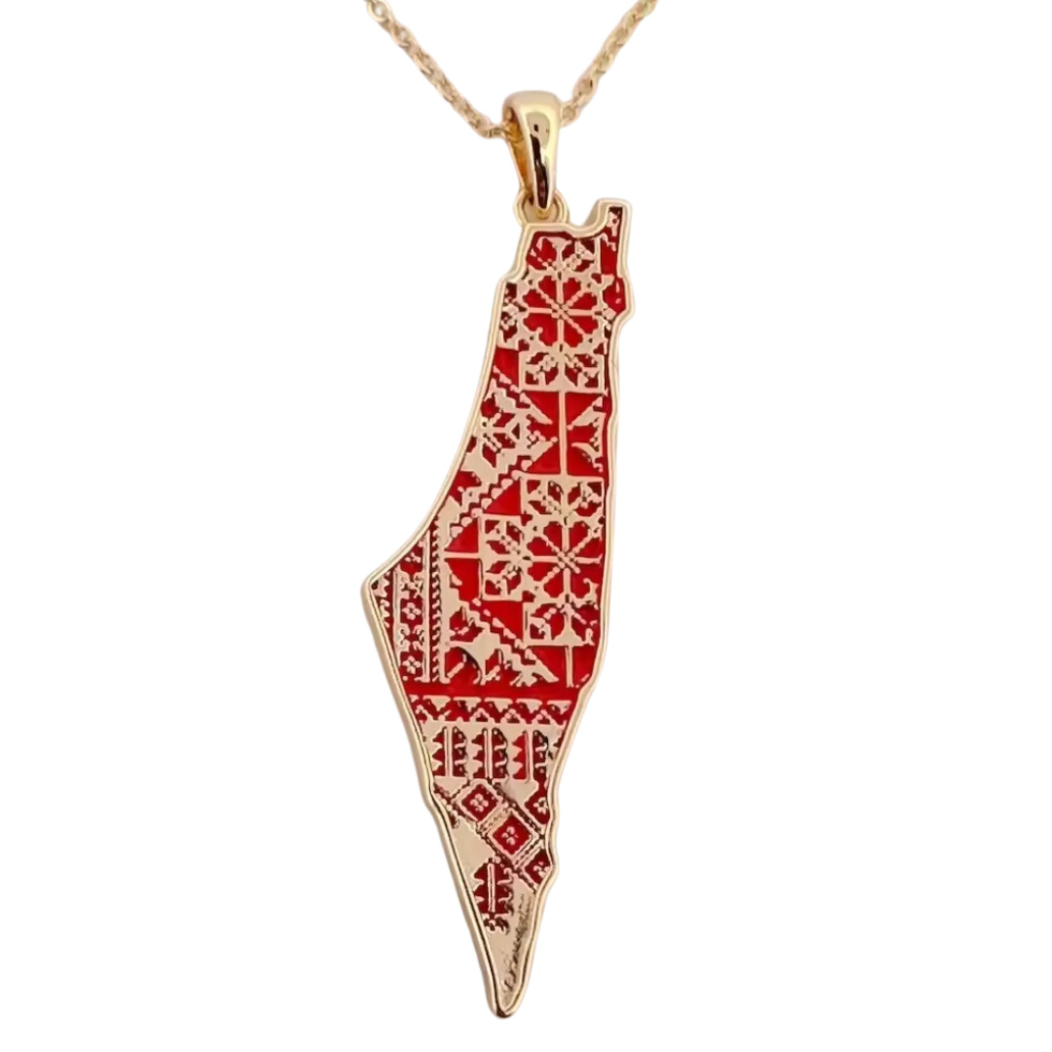 Introducing the Red Tatreez Necklace, a stunning piece that beautifully showcases the intricate and symbolic Palestinian art form of tatreez. With a reflective finish and a unique design featuring the Palestine map. Celebrate your Palestinian roots and make a difference with this exquisite necklace. This piece is a stunning blend of heritage and elegance. The delicate gold chain complements the vibrant colors and intricate patterns of the tatreez, making it a perfect accessory for any occasion.